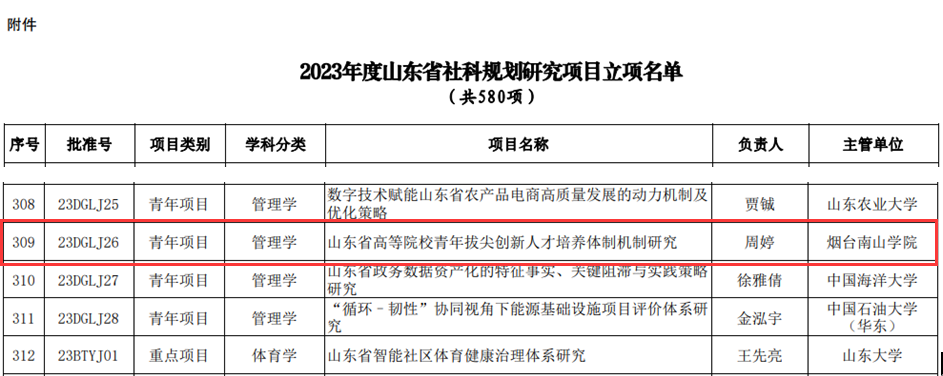 近日,山東省哲學(xué)社會(huì)科學(xué)工作辦公室發(fā)布2023年度山東省社科規(guī)劃研究項(xiàng)目立項(xiàng)項(xiàng)目名單,經(jīng)過通訊初評(píng)、會(huì)議評(píng)審,煙臺(tái)南山學(xué)院青年教師周婷申報(bào)的“山東省高等院校青年拔尖創(chuàng)新人才培養(yǎng)體制機(jī)制研究”喜獲立項(xiàng),位居山東省同類院校前列,學(xué)校也成為煙臺(tái)市唯一民辦高校立項(xiàng)單位。