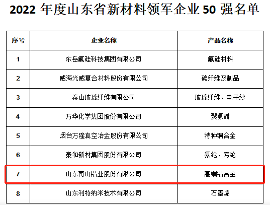 南山鋁業(yè)入選2022年度山東省新材料領(lǐng)軍企業(yè)培育庫入庫名單,并位列50強(qiáng)前列