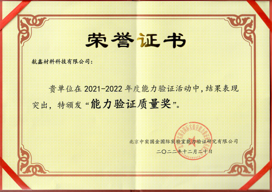 近日,航鑫材料科技有限公司(檢測(cè)中心)在北京中實(shí)國(guó)金舉辦的2021—2022年度實(shí)驗(yàn)檢測(cè)能力驗(yàn)證評(píng)選活動(dòng)中,憑借優(yōu)異的表現(xiàn),榮獲“能力驗(yàn)證質(zhì)量獎(jiǎng)”。