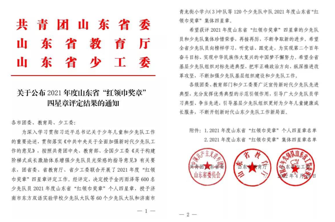 為深入貫徹落實(shí)《中共中央關(guān)于全面加強(qiáng)新時(shí)代少先隊(duì)工作的意見》,近日,2021年度山東省“紅領(lǐng)巾獎(jiǎng)?wù)隆彼男钦隆熍_(tái)市“紅領(lǐng)巾獎(jiǎng)?wù)隆比钦略u(píng)定結(jié)果先后出爐。其中,少先隊(duì)龍口南山雙語學(xué)校小學(xué)部大隊(duì)榮獲煙臺(tái)市“紅領(lǐng)巾獎(jiǎng)?wù)隆奔w三星章,南山雙語學(xué)校蘇小洋等3名少先隊(duì)員榮獲山東省“紅領(lǐng)巾獎(jiǎng)?wù)隆眰€(gè)人四星章。南山雙語學(xué)校蘇小洋、張皓宇、劉乃成等3名少先隊(duì)員榮獲煙臺(tái)市“紅領(lǐng)巾獎(jiǎng)?wù)隆眰€(gè)人三星章。