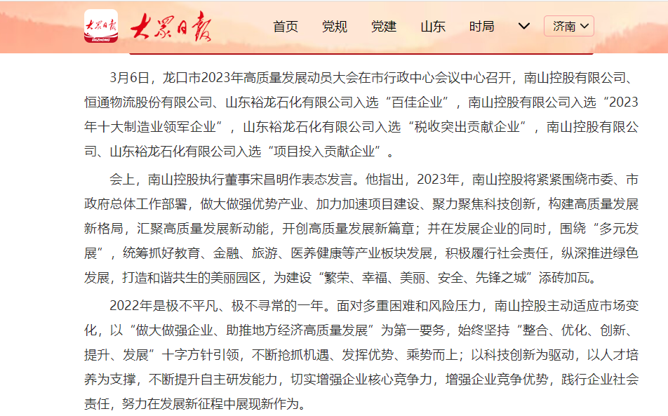 大眾日報:南山多家企業(yè)在龍口市高質(zhì)量發(fā)展動員大會上榮獲表彰
