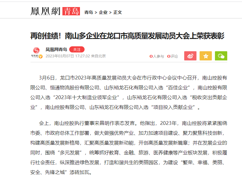 鳳凰網(wǎng):南山多企業(yè)在龍口市榮獲表彰