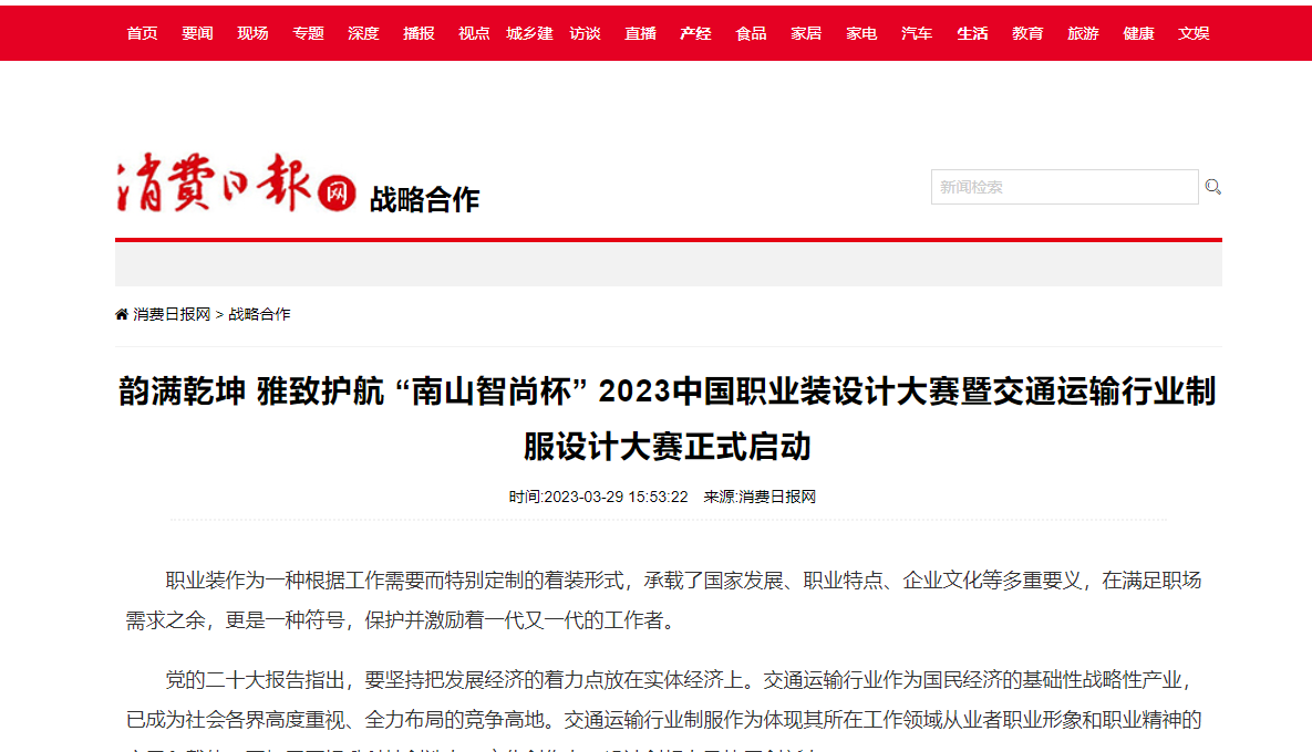 消費日報:“南山智尚杯” 2023中國職業(yè)裝設(shè)計大賽暨交通運輸行業(yè)制服設(shè)計大賽正式啟動