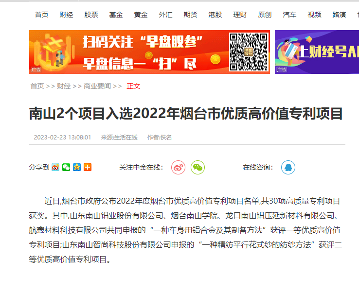 中金在線:南山2個項目入選2022年煙臺市優(yōu)質(zhì)高價值專利項目