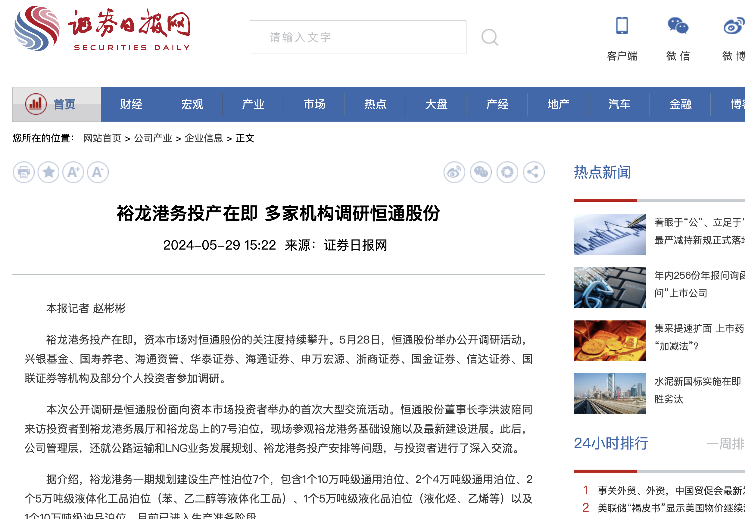 證券日報:裕龍港務(wù)投產(chǎn)在即 多家機(jī)構(gòu)調(diào)研恒通股份