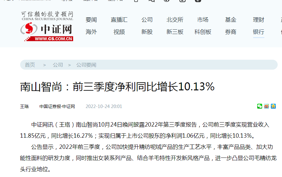 中證網: 南山智尚前三季度凈利同比增長10.13%