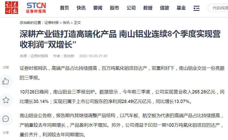 證券時報:深耕產業(yè)鏈打造高端化產品 南山鋁業(yè)連續(xù)8個季度實現(xiàn)營收利潤“雙增長”