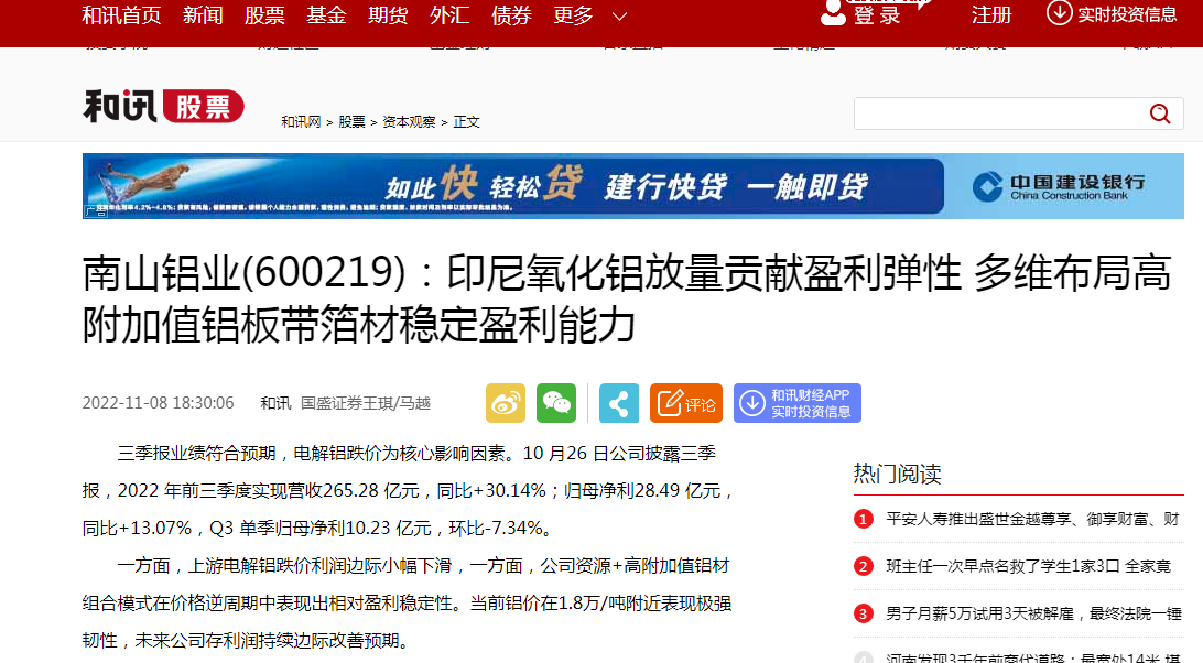 和訊網:南山鋁業(yè)印尼氧化鋁放量貢獻盈利彈性
