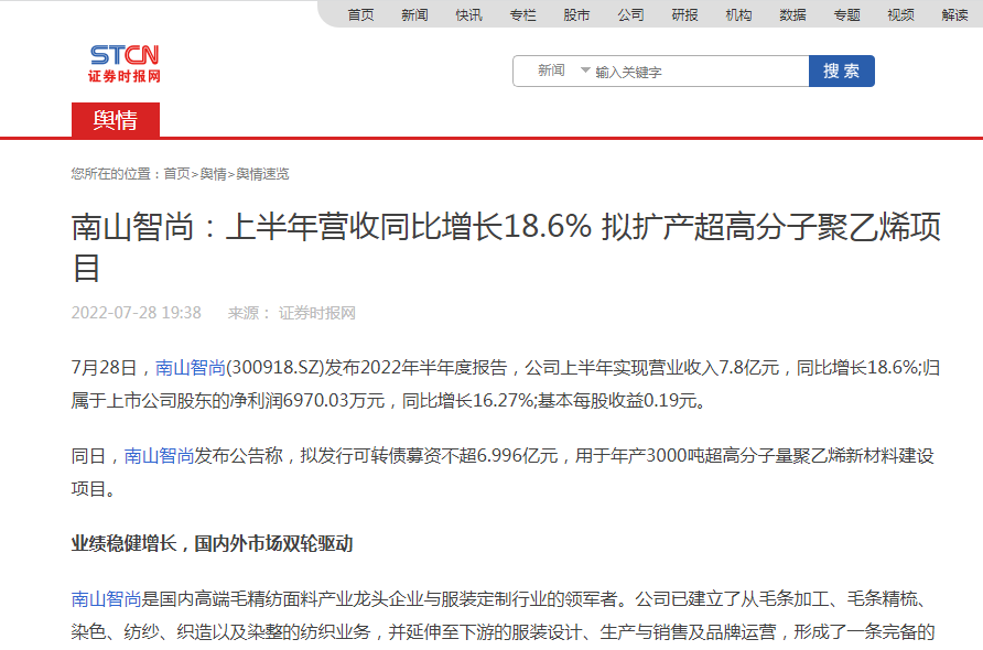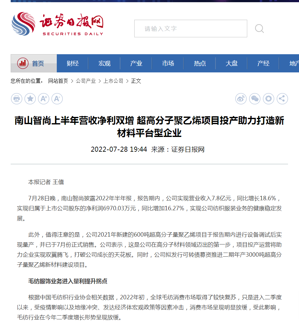南山智尚著力打造“雙鏈協(xié)同”發(fā)展體系,是全球?yàn)閿?shù)不多的毛紡織服裝產(chǎn)業(yè)鏈一體化公司,擁有從羊毛到成衣完整的毛紡織服飾產(chǎn)業(yè)鏈。同時(shí),建設(shè)3600噸超高分子量聚乙烯產(chǎn)業(yè)園區(qū)。使雙鏈驅(qū)動(dòng)的南山智尚具有持續(xù)效益增長(zhǎng)的超強(qiáng)壁壘優(yōu)勢(shì),主營(yíng)業(yè)務(wù)涵蓋精紡呢絨、服裝、超高分子量聚乙烯相關(guān)產(chǎn)品的研發(fā)、設(shè)計(jì)、生產(chǎn)與銷售。