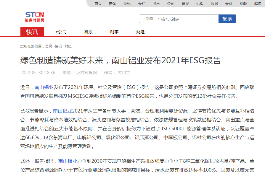 綠色制造鑄就美好未來,南山鋁業(yè)發(fā)布2021年ESG報告-證券時報