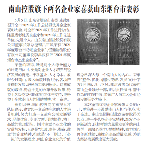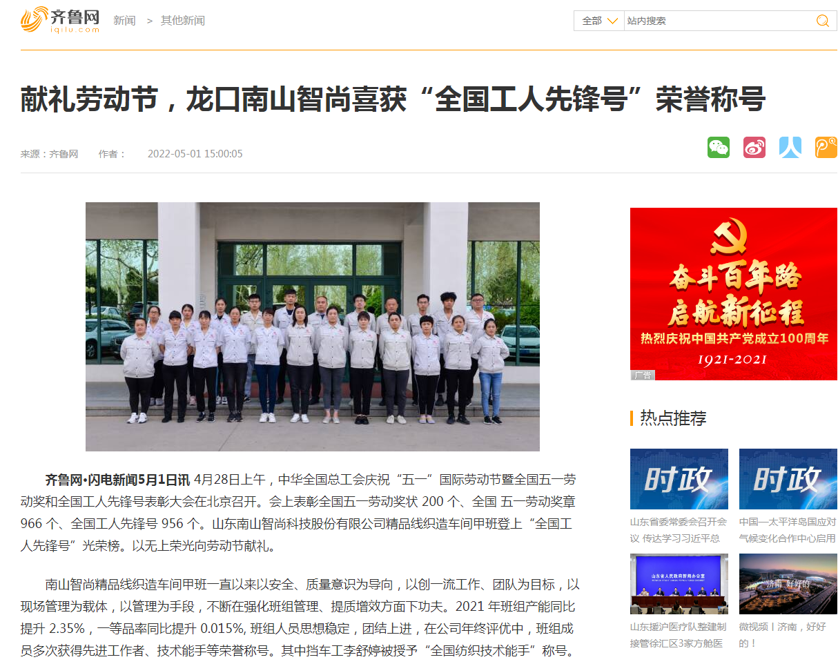 龍口南山智尚喜獲“全國(guó)工人先鋒號(hào)”榮譽(yù)稱號(hào)-閃電新聞