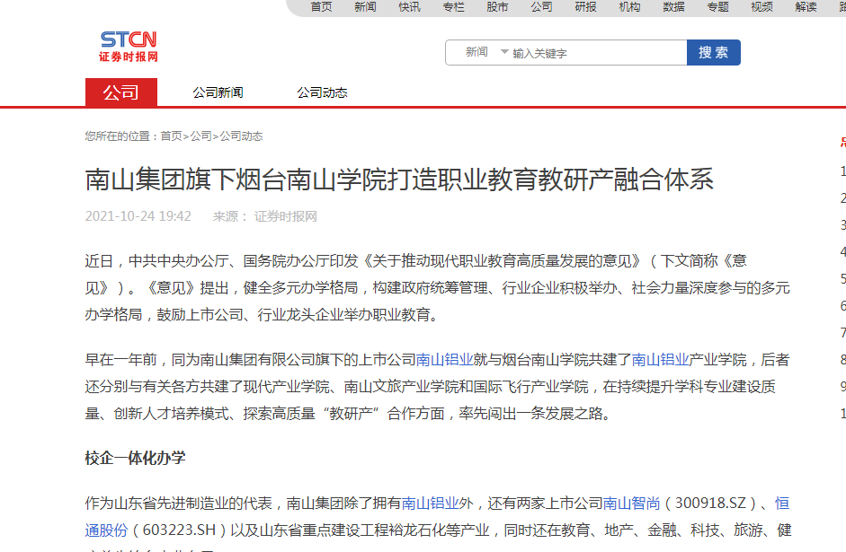 煙臺南山學(xué)院打造職業(yè)教育教研產(chǎn)融合體系-證券時報