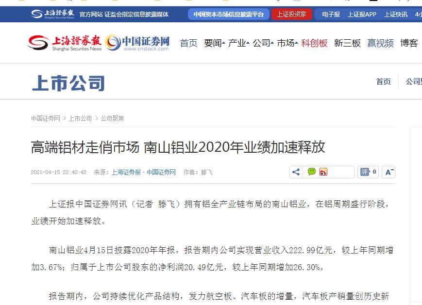 4月26日晚間,南山鋁業(yè)公布了亮麗的2021年一季報:實現(xiàn)營業(yè)收入57.36億元,同比增長15.98%;凈利潤5.36億元,同比增長82.79%;扣非后凈利5.24億元,同比增長92.83%;經(jīng)營活動產(chǎn)生的現(xiàn)金流量凈額達到7.82億元,同比增長50.17%。公司表示,業(yè)績增長的主要原因系報告期內(nèi)公司終端高附加值產(chǎn)品銷量增加,同時本期鋁錠價格上漲,公司依托全產(chǎn)業(yè)鏈成本優(yōu)勢,凈利潤大幅增加。