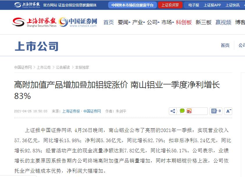 南山鋁業(yè)一季度凈利增長83%-中國證券網(wǎng)
