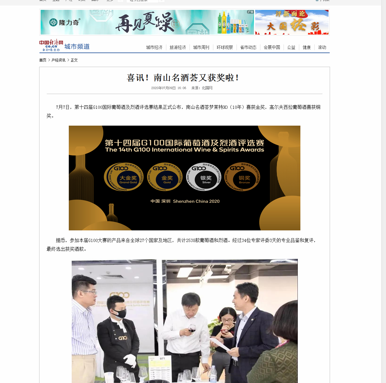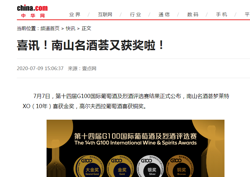 7月7日,第十四屆G100國際葡萄酒及烈酒評選賽結果正式公布,南山名酒薈夢萊特XO(10年)喜獲金獎,高爾夫西拉葡萄酒喜獲銅獎。