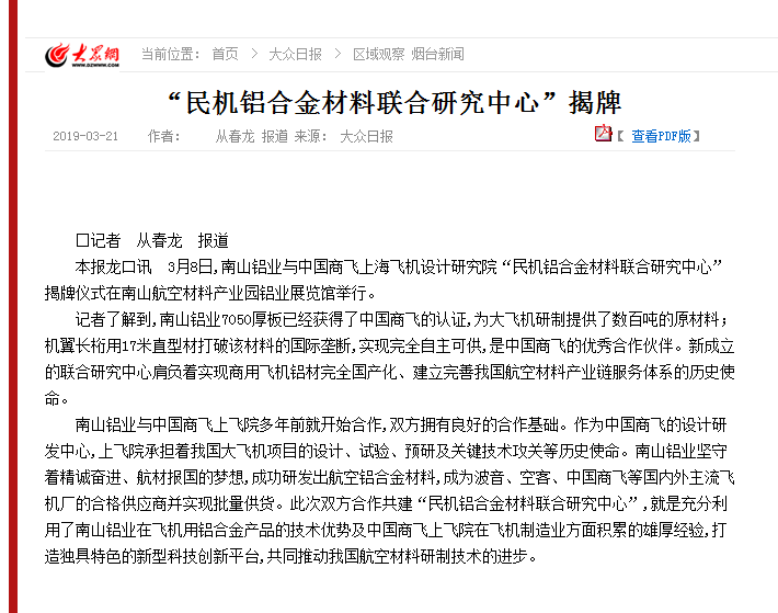 “民機(jī)鋁合金材料聯(lián)合研究中心”揭牌-大眾日報(bào)