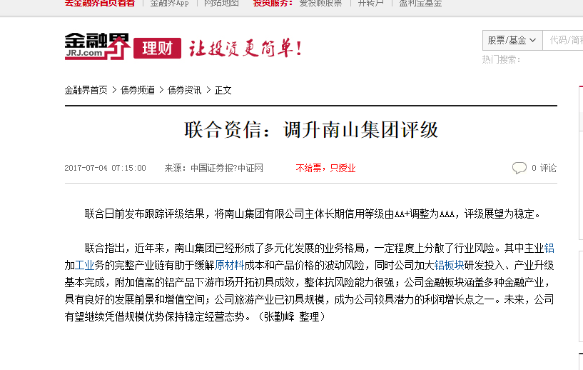 聯(lián)合資信:調(diào)升南山集團(tuán)評級-金融界