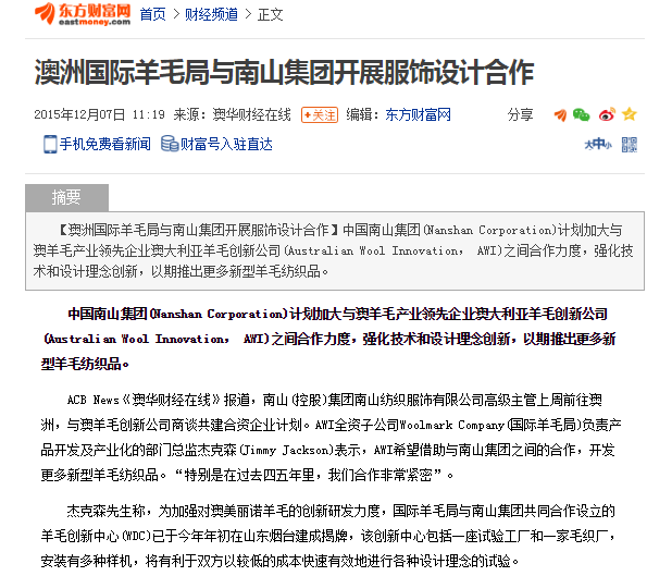 澳洲國際羊毛局與南山集團開展服飾設計合作-東方財富網