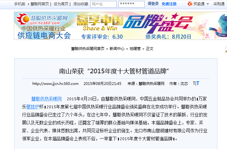 南山榮獲“2015年度十大管材管道品牌” -慧聰網